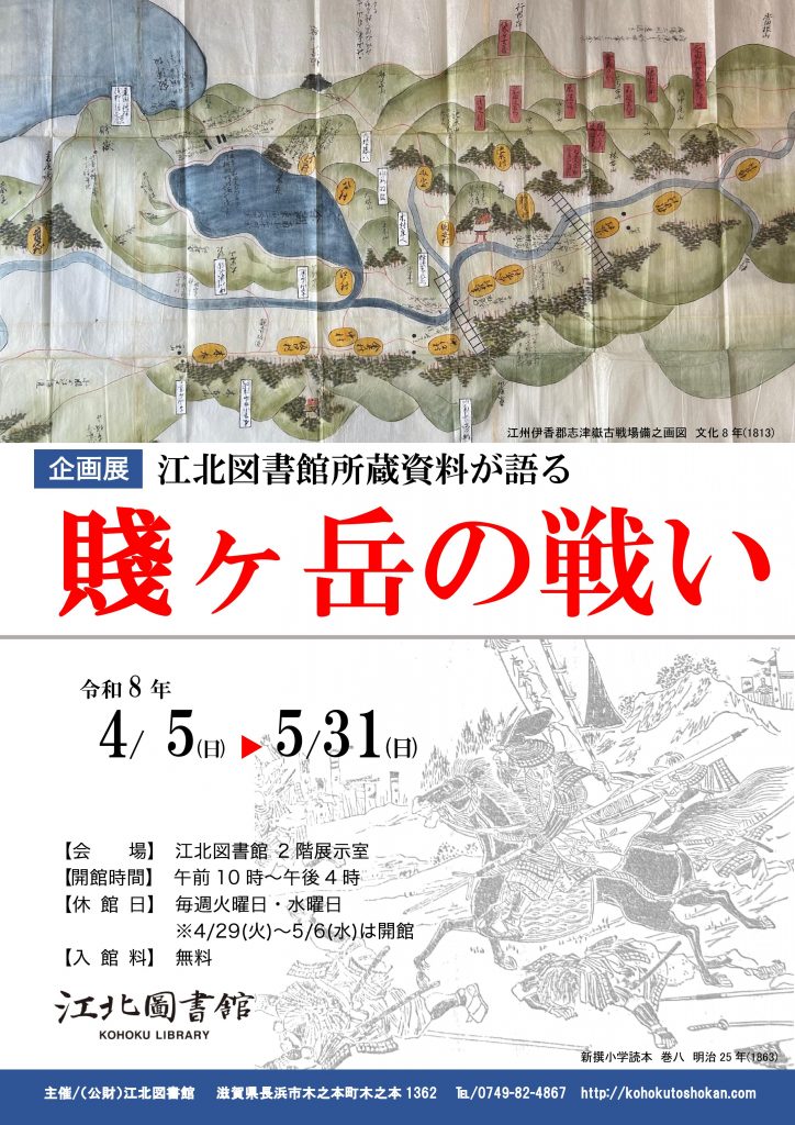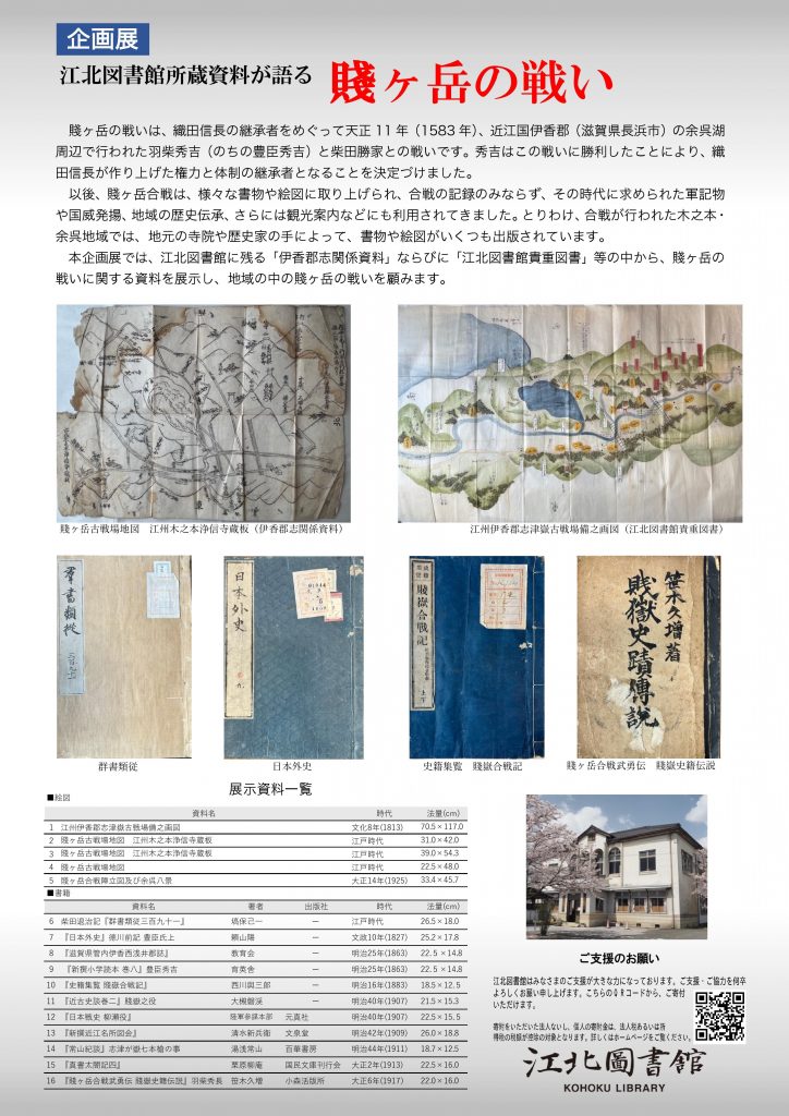本企画展では、江北図書館に残る「伊香郡志関係資料」ならびに「江北図書館貴重図書」の中から、賤ヶ岳の戦いの関する資料を展示し、地域の中の賤ヶ岳の戦いを顧みます。